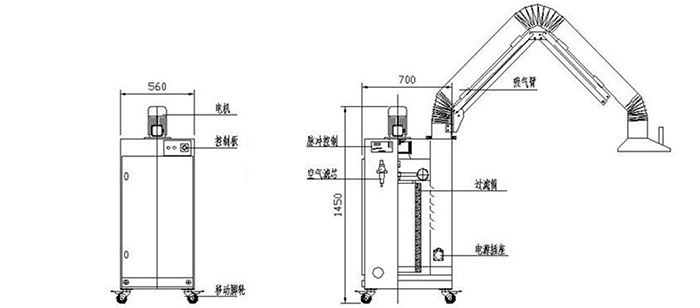 移动式焊接烟尘净化器工业旱烟净化器单双臂移动式焊烟净化器是焊烟净化器的其中一种,是针对各种工业需求设计的移动式高效净化器,适用于局部焊接烟尘处理的一种节能、环保、经济型焊烟净化器,可选用不同型号的活动臂管和排气风机,使其在不同的工作地点移动更方便、更灵活。移动式焊烟净化器移动灵活平稳, 烟尘捕获率高,操作简单,后续维修费用低。单臂焊烟净化器适用于焊接、抛光、切割、打磨等工序中产生烟尘和粉尘的净化以及对金属、贵重物料的回收等,可净化大量悬浮在空气中对人体有害的细小金属颗粒。具有净化效率高、噪声低、使用灵活、占地面积小等特点。单臂焊烟净化器是一种工业环保设备,通常用在锡焊、手弧焊等焊接场所,用来收集净化产生的焊接烟尘,起到保护环境,保护工人身体健康的目的。